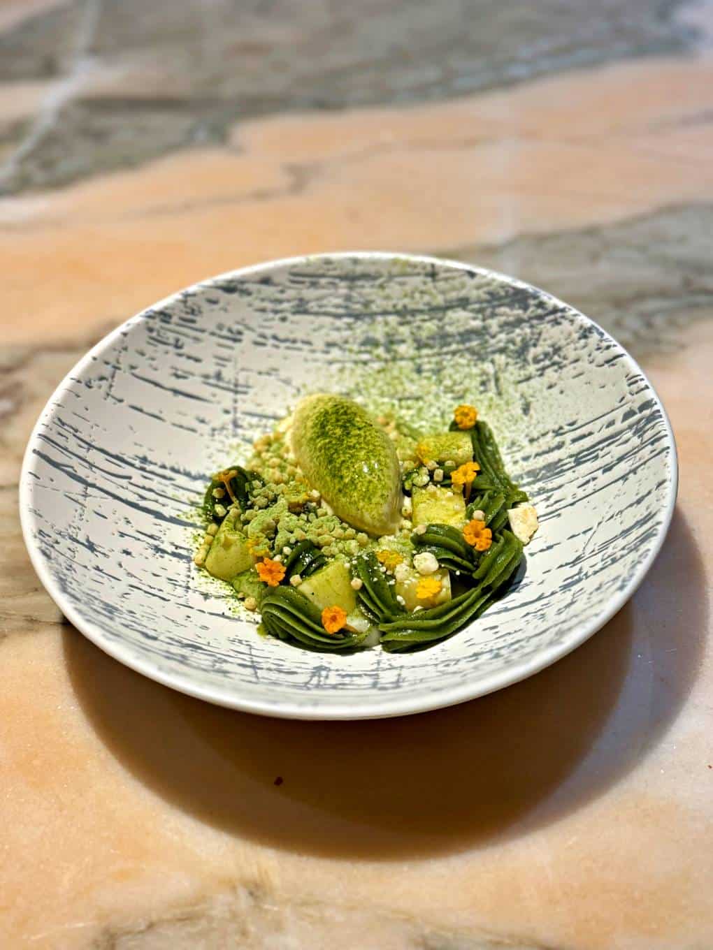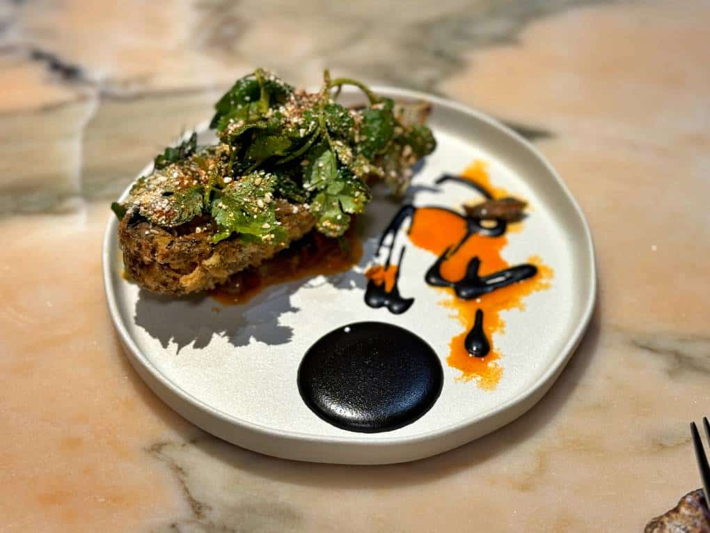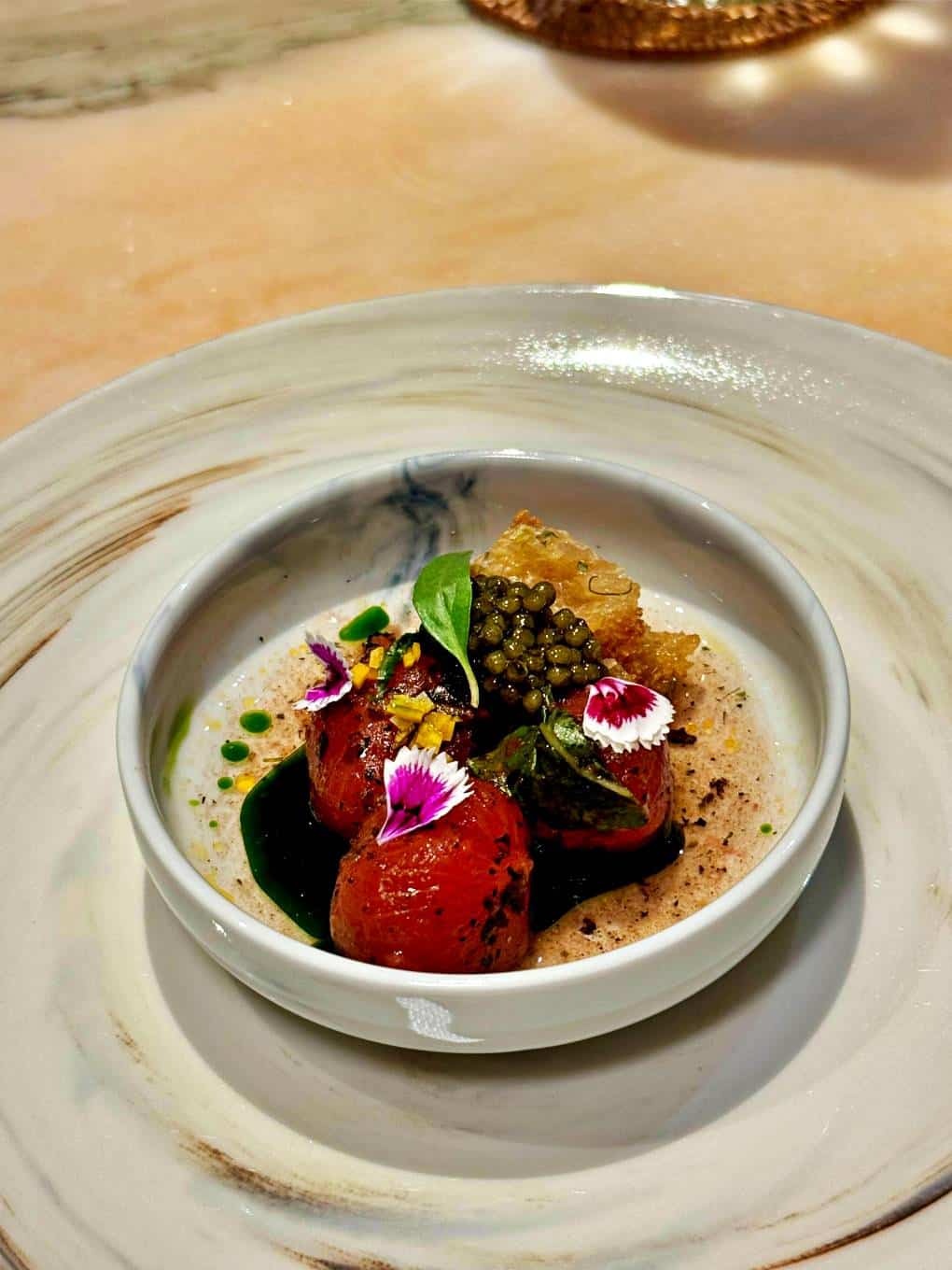 Brehm’s warning about the tantalizing heat of the next dish, Tortong Talong, a Filipino-inspired dish, precedes its arrival—a fresh buffalo mozzarella-stuffed eggplant, complemented by herb salad, ikan bilis ratatouille, and a black sesame dressing that expertly tempers the tingling aftertaste, a result of the dish’s intriguing interplay of flavours.