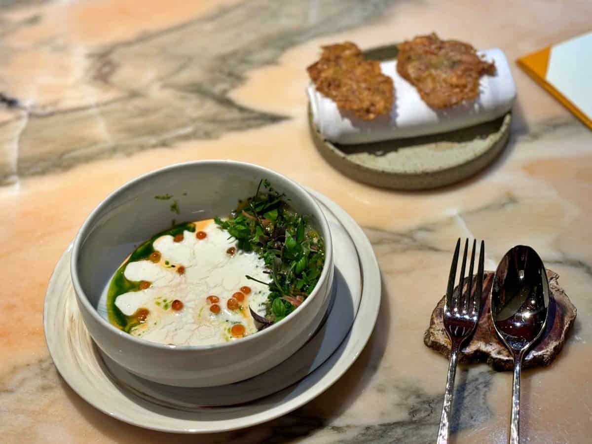 We shared the beautifully charcoal-grilled seabass, wheat bran breaded and adorned with a mosaic of sauces, akin to an artist’s chaotic palette. From smokey buttermilk, charred spring onion relish, seaweed & konbu dashi, tomato jam, zhoog, seaweed powder. It takes a leap of culinary enthusiasm to present the sauces something like that. The result? It showcased an unparalleled culinary fervor.
